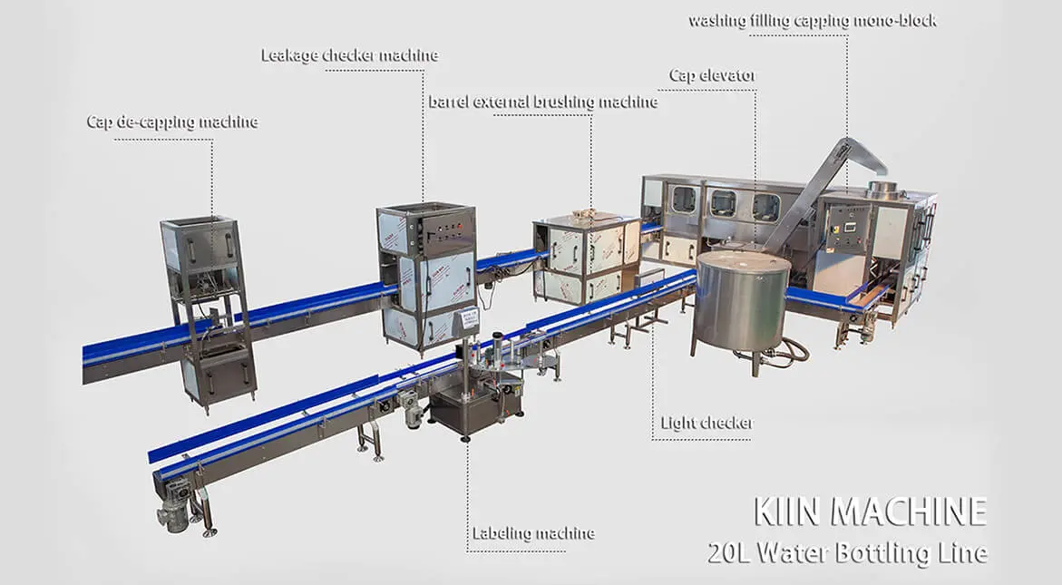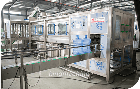 King Machine 5 gallon water production line consists of empty bottle transferring, internal bottle brushing, auto de-capper, external bottle brushing,